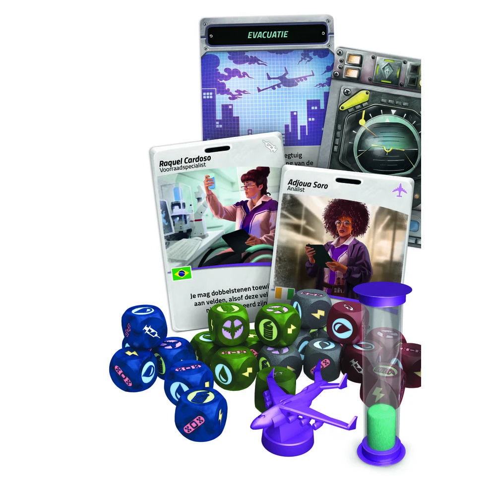 - Het spel bevat een plastic vliegtuig, 24 dobbelstenen, vier pionnen, een spelbord, twintig voorraadkratten, een zandloper, 24 stadkaarten, zeven karakterkaarten, vier overzichtskaarten, vijftien crisiskaarten, negen tijdfiches en een afvalfiche.