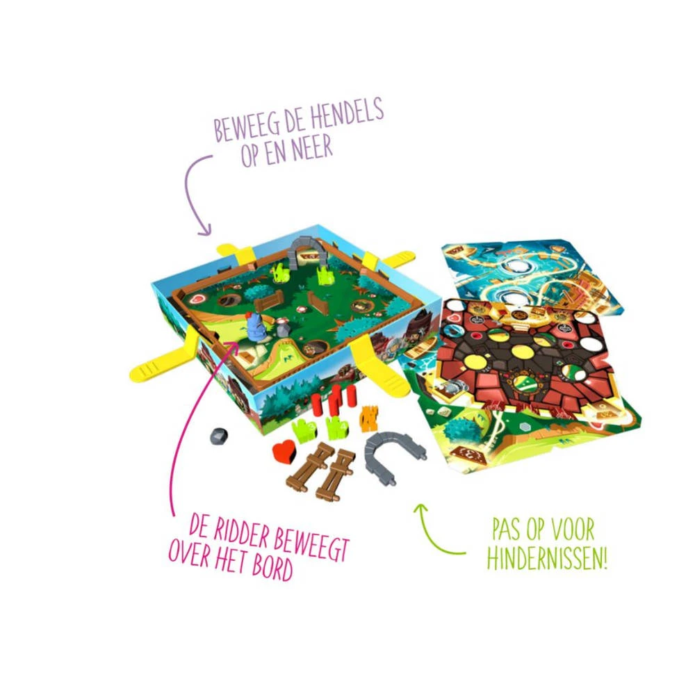 - Het spel bevat een spelbord met vallen, vier hendels, twintig landschapskaarten, een rollende ridder, acht obstakels, negen vallen, een levensteller, een ‘hart’-steen, een spelbewaarder en een spelhandleiding.
