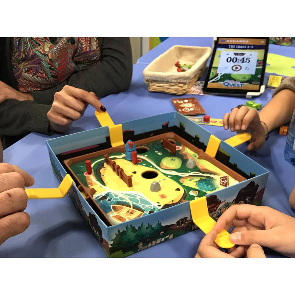 Dit spannende Slide Quest spel is genomineerd voor speelgoed van het Jaar 2019! De slechteriken hebben de controle over het prachtige koninkrijk overgenomen in Slide Quest en het is een puinhoop. Je moet de wereld redden, en snel! Leid samen met je vrienden deze dappere, rollende ridder door het turbulente avontuur, bezaaid met valkuilen en wendingen. Slide Quest is een fantastisch bordspel waarbij je probeert om de ridder te helpen om het einde van elke kaart te bereiken en daarbij valstrikken en obstakels te vermijden. Gebruik de hendels, die je aan de doos vastmaakt, om de ridder te laten schuiven, maar let wel op. Er zijn namelijk diverse hindernissen, bewakers en een schurk die jouw weg moeilijk maken en jouw levensteller laten dalen. Er zijn in totaal twintig kaarten, vier verschillende werelden met elk vijf kaarten, die je kunt spelen. Om het spel te winnen probeer je de ridder veilig en succesvol door een wereld van vijf kaarten, bij een kleine queeste, of de volledige twintig kaarten, grote queeste te loodsen en het koninkrijk te redden. De moeilijkheidsgraad wordt hoger naarmate je van de ene naar de andere wereld gaat. Als je levensteller echter op nul komt, dan verlies je het spel.