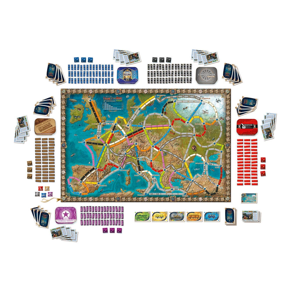 Dankzij een extra groot spelbord met nieuwe illustraties, zeer gedetailleerde treintjes en treinstations in prachtige blikjes, maar ook elke bestemmingskaart die ooit verschenen is sinds de eerste uitgave, is dit met recht een unieke jubileumeditie van Ticket to Ride Europe! Naast het basisspel Europe bevat deze editie ook 3 spelvarianten: Europa 1912, Mega Europa en Grote Steden van Europa.