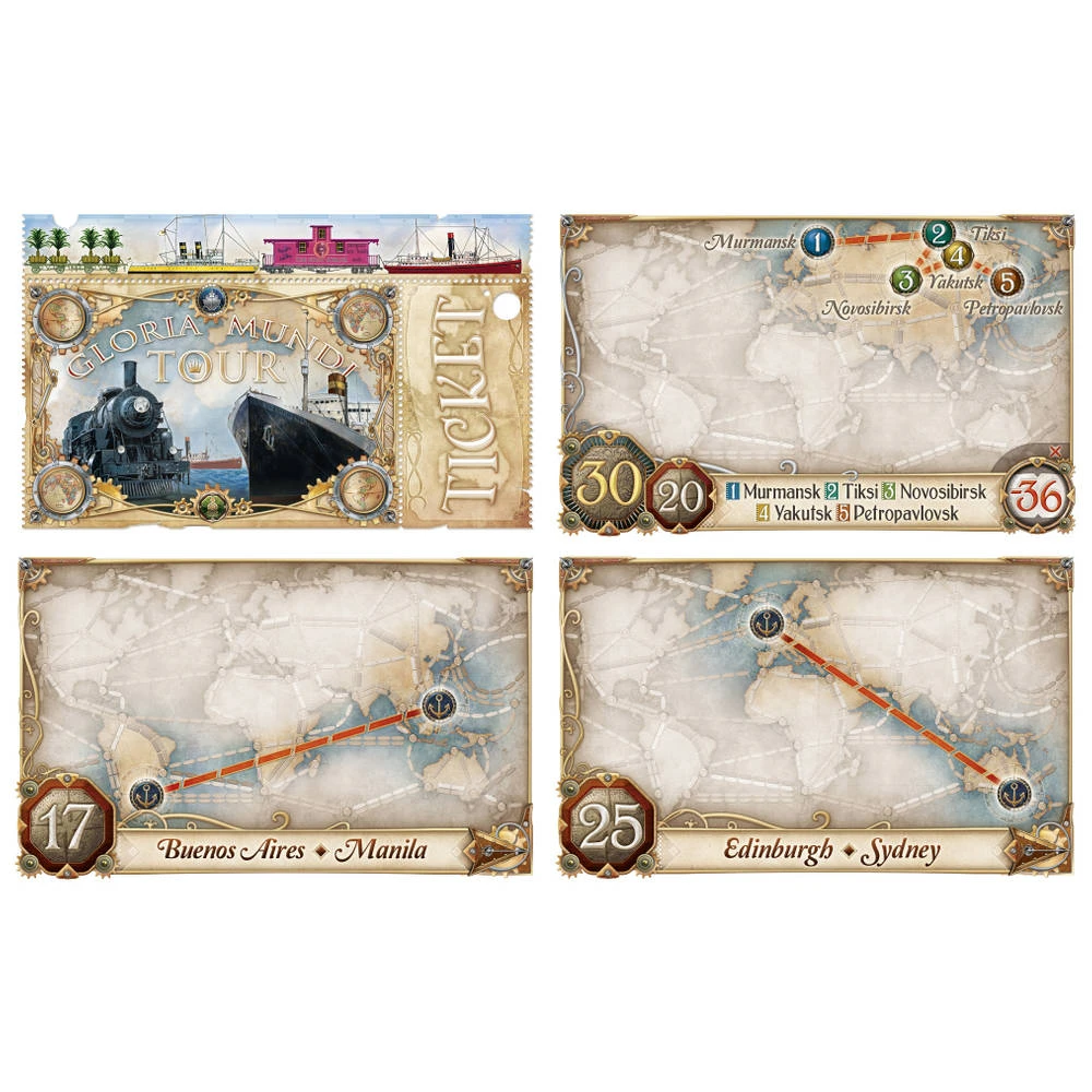 - Het spel bestaat uit een dubbelzijdig speelbord, 165 treinwagons, 250 schepen, vijftien havens, vijf scoremarkers, 140 reiskaarten (trein, schip, double ship & wild) en 120 ticketkaarten (65 voor de wereld, 55 voor de Great Lakes).