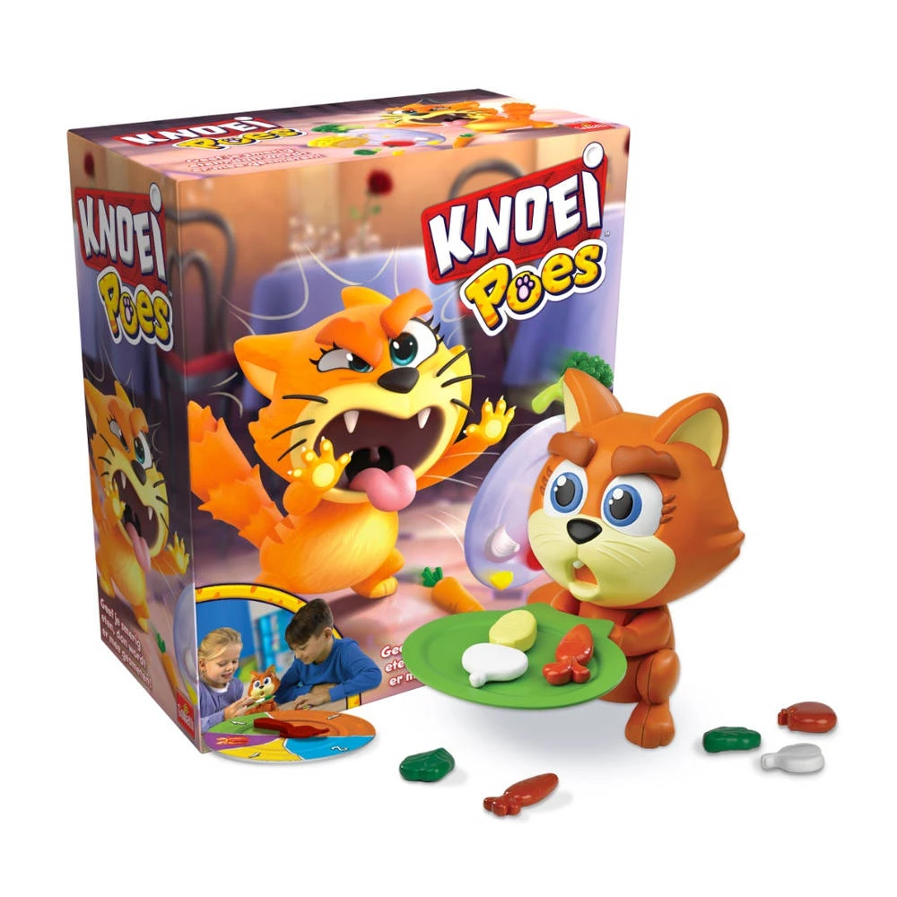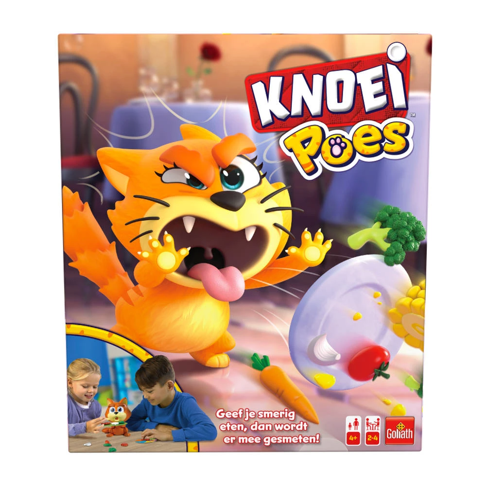 Verdeel de groenten aan het begin van het spel over alle spelers en zet Knoeipoes rechtop in haar lieve positie. Nu leggen de spelers een voor een voorzichtig de groenten op het bord van Knoeipoes. Met elk stuk groente wordt het bord zwaarder en wordt Knoeipoes bozer. Leg jij nu het laatste stuk neer waardoor het bord te zwaar wordt? Dan gooit ze het hele bord de lucht in! Nu moet jij twee stukken groenten extra pakken. Zet vervolgens Knoeipoes weer terug in de startpositie en speel verder. Degene die als eerste alle groenten kwijt is, wint!