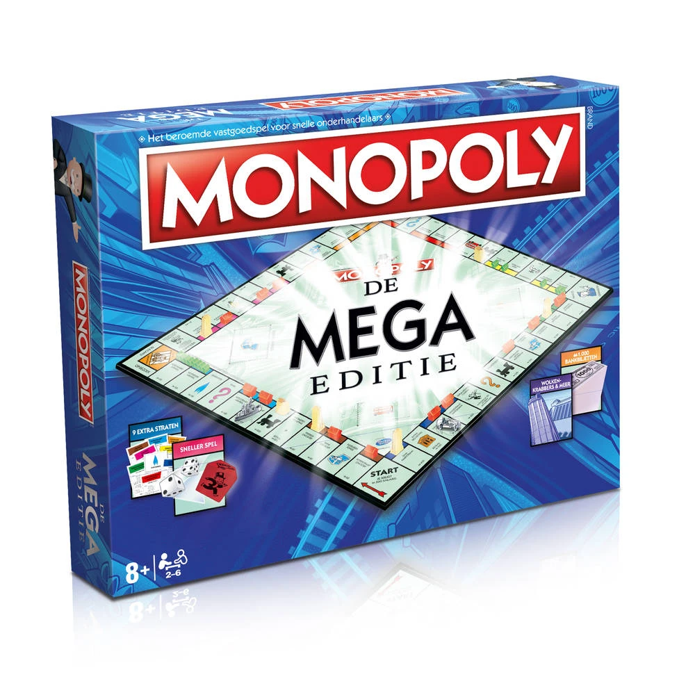 Een andere manier om het populairste bordspel ter wereld te spelen! Monopoly is tijdloos. Jong en oud, iedereen houdt ervan! Maar met Monopoly: De MEGA Editie kun je nog meer straten bezitten, meer gebouwen kopen en meer geld verdienen. Er zijn maar een paar nieuwe regels die je moet leren. MEGA GROOT: het speelbord heeft 12 extra vakken. MEGA-BOUWFESTIJN: wolkenkrabbers bouwen. MEGA-GELUK: gooi met drie dobbelstenen: twee gewone en een speciale geluksdobbelsteen. Zelfs met deze nieuwe regels is Monopoly: De MEGA Editie een snel en eenvoudig spel dat heel dicht bij het origineel staat, maar andere mogelijkheden en risico’s met zich meebrengt.