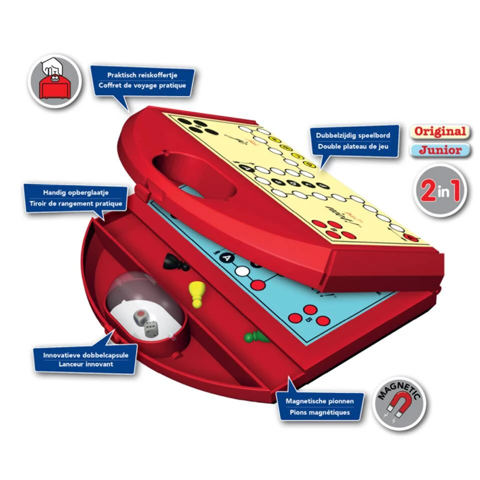Nu heb je Jumbo Mens erger je niet! original en junior in één doos! Deze set bevat een dubbelzijdig speelbord in een handige travelcase.