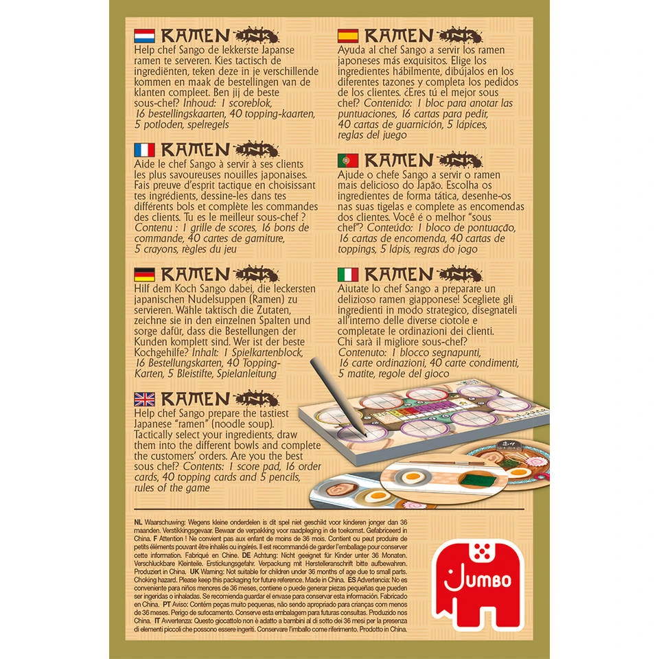 Help chef Sango de lekkerste Japanse ramen te serveren. Kies tactisch de ingrediënten, teken deze in je verschillende kommen en maak de bestellingen van de klanten compleet. Ben jij de beste sous-chef? In 6 rondes tekenen de spelers steeds de ingrediënten van 2 topping-kaarten in de 8 kommen op hun scorekaart. De eerste topping-kaart kiezen de spelers zelf en de topping-kaart die overblijft moet door alle spelers worden getekend. Teken de ingrediënten van topping-kaarten in de juiste kommen om punten te verdienen. Volle kommen leveren een bonus op. De speler die het slimst speelt en de meeste punten weet te verdienen is de winnaar.