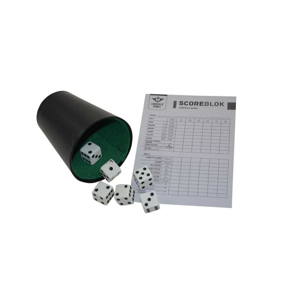 - Bevat 6 dobbelstenen, een scoreblokje en een dobbelbeker.