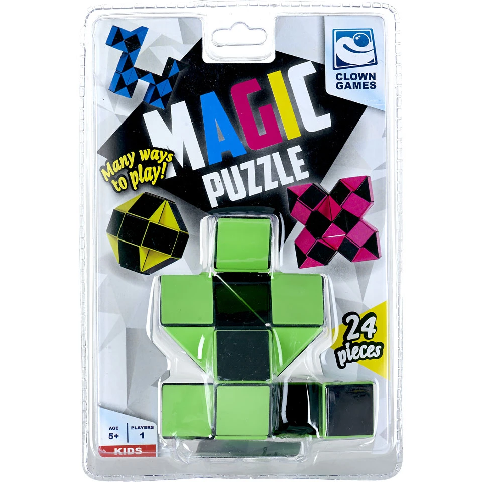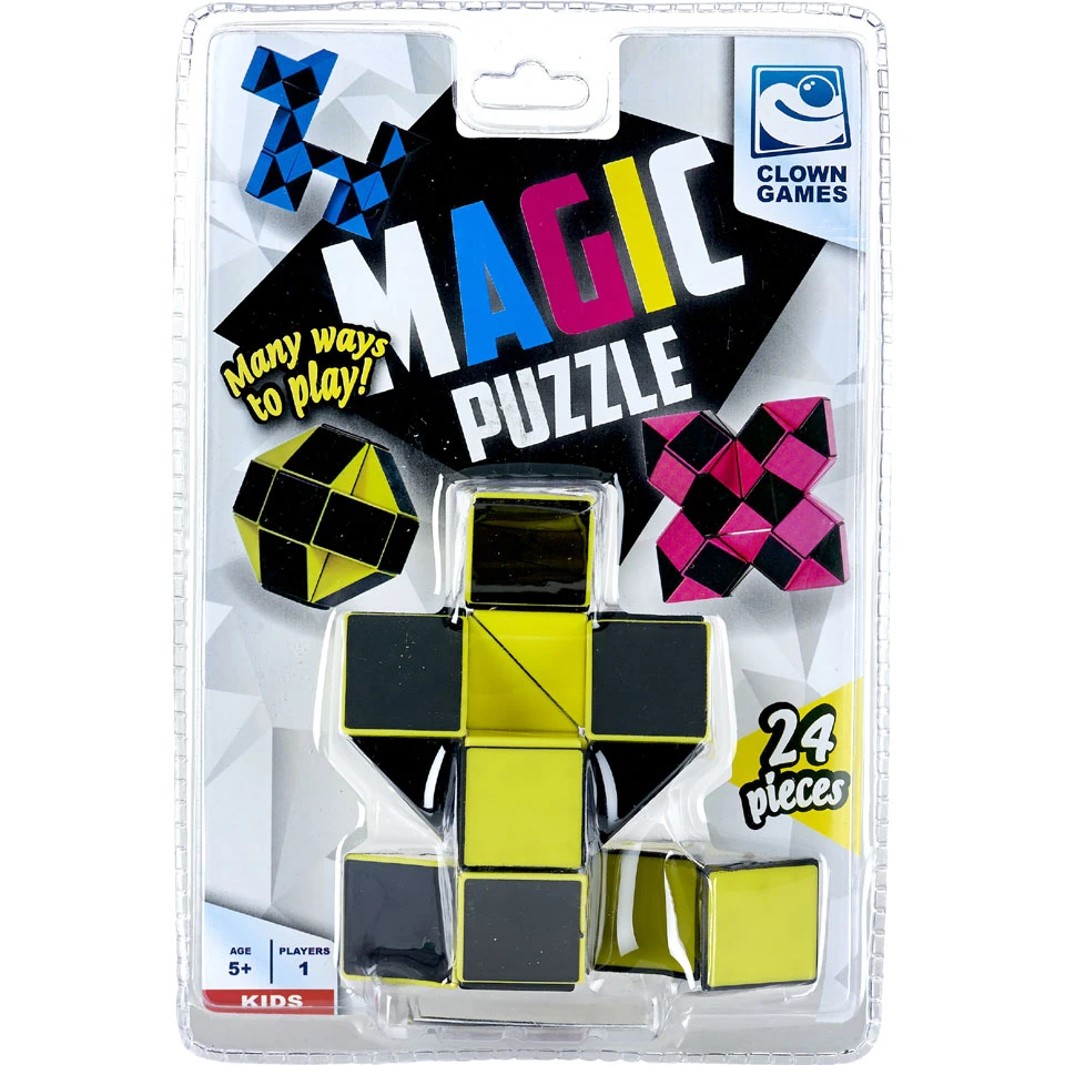 De Clown Games Magic Puzzle is verkrijgbaar in de kleuren geel, groen, roze en blauw en bestaat uit 24 draaibare elementen.