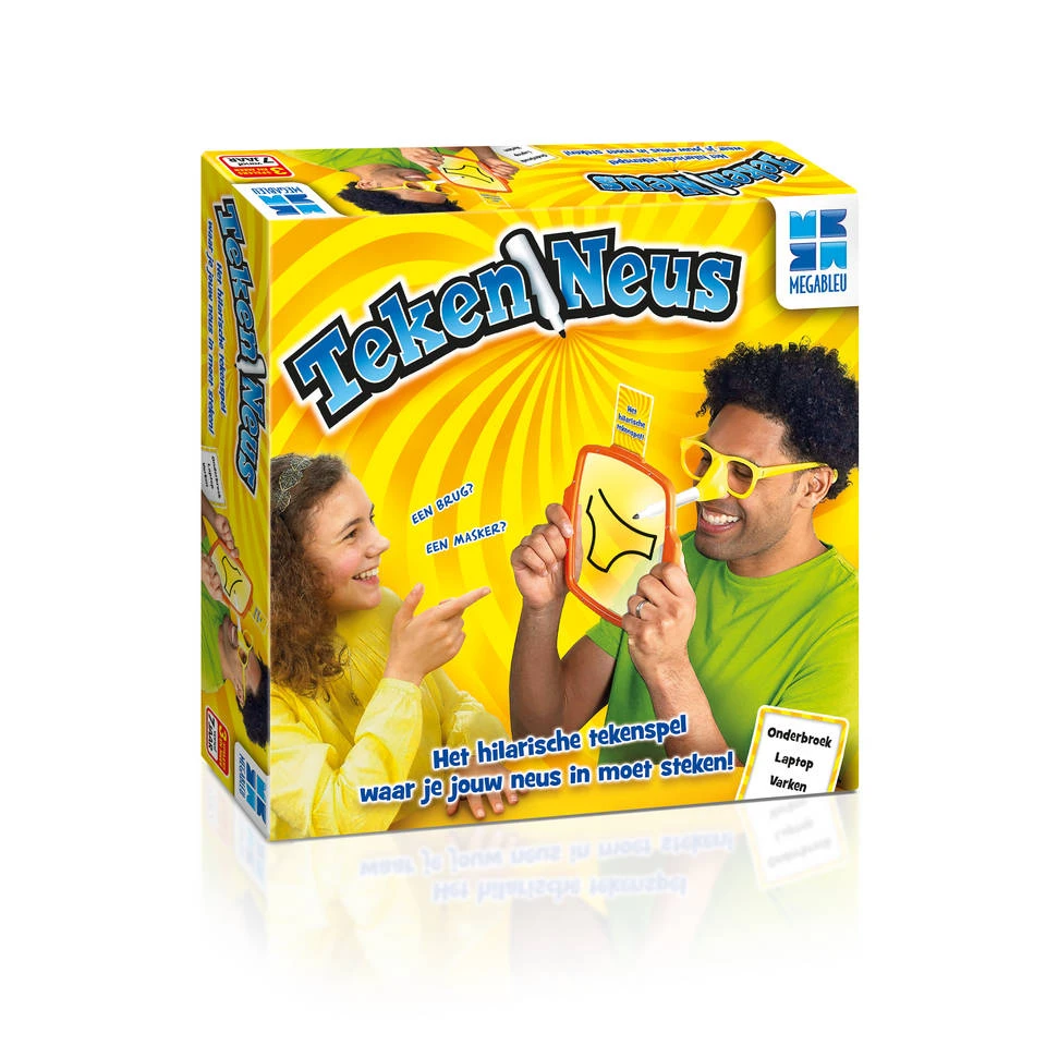 Trek een kaart en teken uit de vrije… Neus?! Met het familiespel Tekenneus, teken je namelijk met je neus! Zet de gekke bril met stifthouder op, trek een kaart en zet de kaart bovenop het tekenbord. Teken ieder woord van het lijstje en laat de andere spelers ze één voor één raden. Het lijkt misschien gemakkelijk, maar op deze manier tekenen doe je heus niet met de vingers in de neus! Voor ieder woord dat wordt geraden, scoren zowel de tekenaar als de speler die het antwoord juist hebben een punt. De speler met de meeste punten aan het einde van het spel is de winnaar!