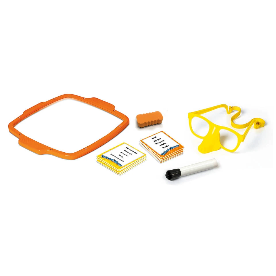 - Inhoud: 1 uitwisbaar tekenbord, 1 TekenNeus bril met elastische hoofdband, 2 opzetstukken voor markeerstift, 1 markeerstift, 45 kaarten (90 lijstjes met 5 woorden) en 1 bordwisser.