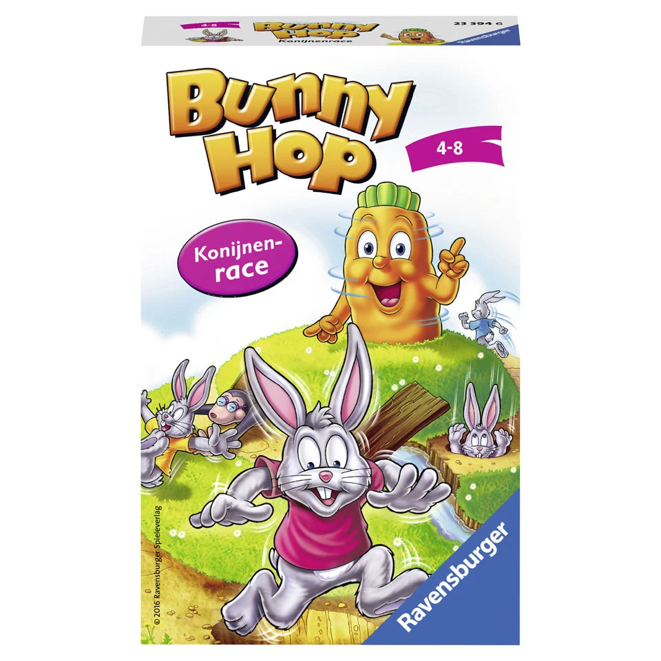 Bij de spannende race naar de wortel bepaalt het geluksrad hoe ver de konijnen mogen huppen. Op de veilige velden gaat het snel vooruit. Maar hopla! Valt een konijn in een gevaarlijk gat, dan begint hij weer van vooraf aan! Dit Bunny Hop konijnenrace reisspel van Ravensburger kun je nu overal spelen.